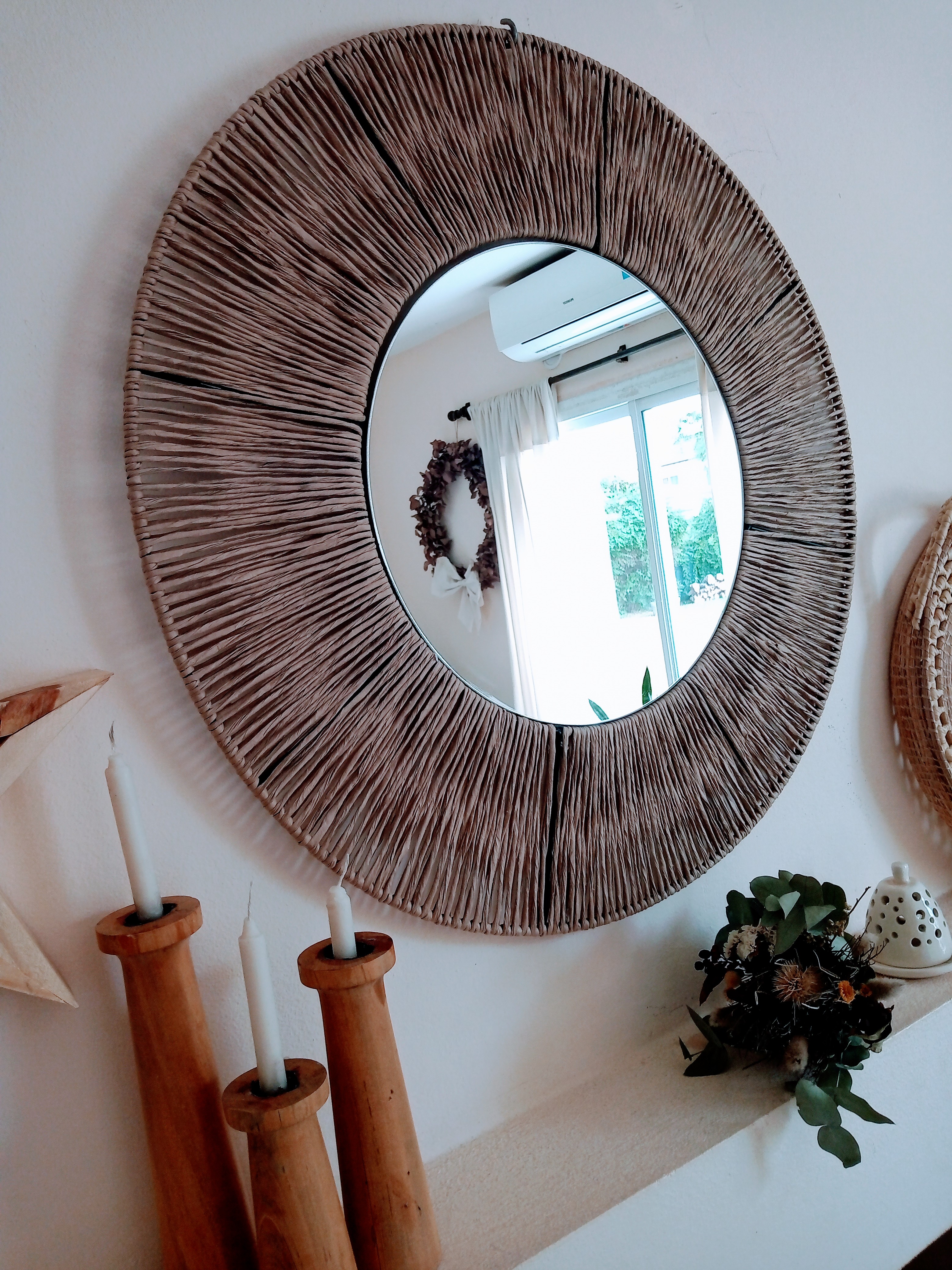 Espejo CRUZ estructura de hierro, hilado en Kraft.